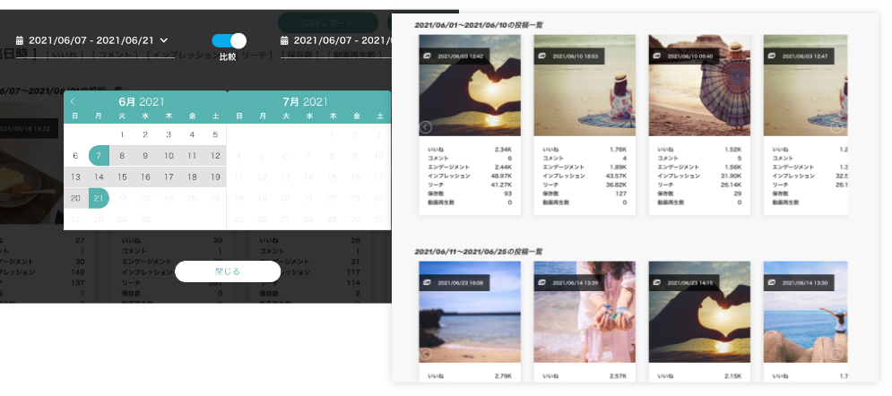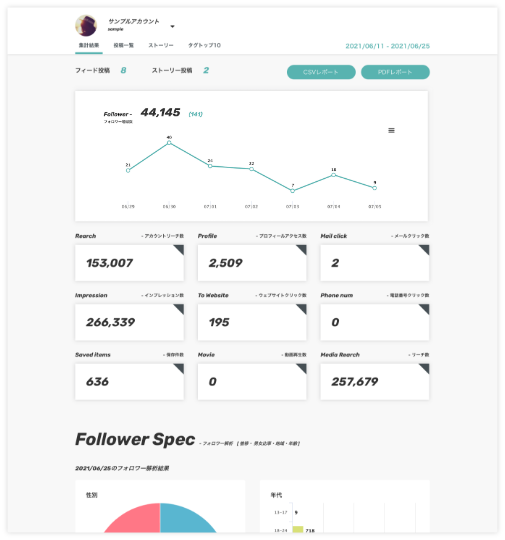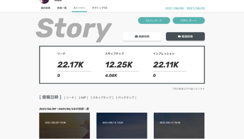 投稿はアカウント作成時から現在までの全てのフィード投稿を取得できます。フォロワー数の推移やストーリーのデータなど、その他の数値はご登録時点からのデータ収集となります。